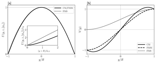 appearing in the inner solutions for and u. The transversal variable y is restricted to the interval for the FMS geometry, which lacks reflection symmetric with respect to the plane . For CM and FMM, y is further restricted to , since, for FMM, it holds that as noticed in Figure 1.
