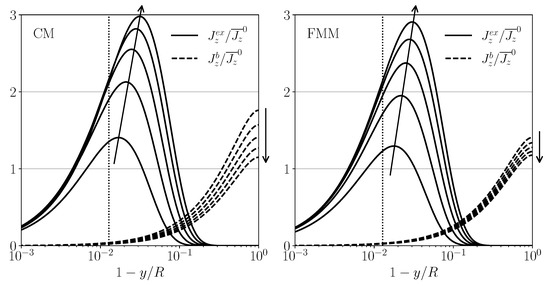 For comparison, in Figure 5b, the velocity factor according to Equation (31) is shown for the three geometries. Note that no distinction is required between inner and outer forms of this velocity factor. Different from flat sheet geometries and owing to curvature, for CM has its peak value attained away from the membrane wall at radial distance from the center-line. While in CM and FMM due to symmetry, the curve of in FMS is strongly asymmetric with , which reflects the impermeability of the substrate wall.