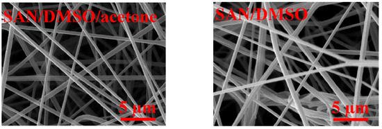 Nanofibrous SAN membranes were fabricated using DSMO solvent and DMSO/acetone solvents (7:3 volumetric ratio). As shown in Figure 3, using a single DMSO solvent caused fiber fusion due to its excessive remaining. However, using the mixed solvent system, this undesirable effect did not occur due to the aid of acetone by reducing the boiling point of DMSO/acetone solvents (DMSO boiling point, 189 °C; acetone boiling point, 56 °C). The SAN/DMSO smelled as solvent even after 1 month, but SAN/DMSO/acetone solvent smelled less, and the solvent odor stopped after about 3 days of placing in the ambient condition. With neat membranes, the solvent exposure time was reduced using the simultaneous effect of remaining solvent and hot solvent vapors as the neat fabricated samples were directly applied to the vapor welding process with no delay.