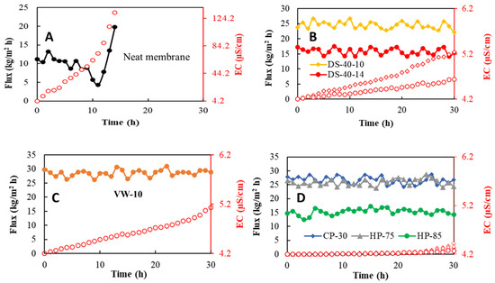Water vapor flux and permeate EC of the neat (A), DS-40-10 and DS-40-14 (B), VW-10 (C), and CP-30 s, HP-75 °C-30 s and HP-85 °C-30 s (D) membranes in the DCMD process (feed concentration = 35 g/L NaCl; temperature difference = 40 °C; feed flow rate = 0.48 L/min; permeate flow rate = 0.48 L/min). Red hollow symbols illustrate EC of membrane distillate.