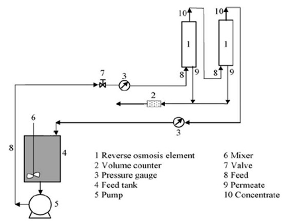 The feed solution after precoat perlite filtration flowed from the tank through the valve and pump to a Culligan Aqua-Cleer RO system. The system was equipped with volume counters (2) and pressure gauges (3), as seen from Figure 1. The system allows transmembrane pressure (TMP) up to 15 bar. The sample flows through the 80 µm filter and 5 µm filter for removal of the bigger particles. Such pre-treated solution is gathered in a feed tank (4). The permeate and retentate were withdrawn continuously from the system in the initial four experiments. In the final experiment the permeate and concentrate were recycled into the feed tank. The capacity was 1.5 L/h for the permeate and 1.9 L/h for the retentate at room temperature.
