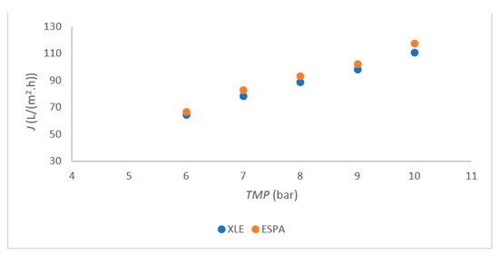 The linear plot for permeability with Millipore water was determined using both RO membranes, FILMTEC XLE-2521 (XLE) and ESPA-2521 (ESPA), as shown in Figure 2. Similar values were also obtained in another study [22]. The permeability of both membranes was followed in the range from 6 bar to 10 bar. A small deviation was observed at 7 bars with both membranes, indicating that the highest flux was reached at 7 bar and 10 bar TMP. The permeate flux remained very similar to that of the trial at 10 bars with concentrate withdrawal. The wastewater fluxes were determined at 111 L/(m2.h) for XLE and 112 L/(m2.h) for ESPA at 10 bar. At other TMP, the flux was slightly lower compared to that at TMP = 7 bar and TMP = 10 bar. Therefore, 7 bar and 10 bar TMP were chosen for further trials with both membranes. The optimal TMP between 7 and 8 was reported in the literature [22,23].