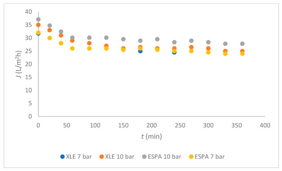 The fluxes of mixed wastewater are shown in Figure 3 for both membranes at two different TMP; 7 bar and 10 bar were chosen according to the millipore water flux and the literature [22]. The fluxes of both membranes were the same at 7 bar, and the curves overlapped each other. Slightly higher fluxes were achieved at 10 bar with ESPA compared with the XLE membrane. The same trends were observed with the time dependence: During 30 min the flux decreased, and then it stabilised at 25 L/(m2.h) for XLE and 27 L/(m2.h) for ESPA at 10 bar.