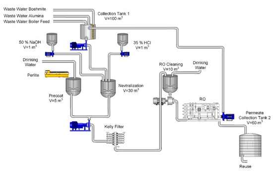The process scheme was designed based on the results. Figure 7 shows the scheme of the process water treatment. The water from alumina scrubbing, wastewater generated after boehmite washing and the effluents after regeneration of an ion exchanger for boiler water treatment, were gathered in a collection tank with the volume 100 m3. After neutralisation with 35% HCl the pre-coat filtration was performed using a pressure leaf (Kelly) filter. A powerful centrifugal pump is required for dosing the perlite precoat. The pre-treated water then flows on to the RO plant. The permeate is collected in a 60 m3 tank. After the treatment, the water can be reused as process water in the production process of alumina and boehmite.