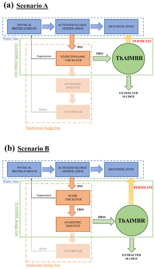 Applications of ThAlMBR in sludge line. (a) Scenario A: downstream of the thickener, (b) Scenario B: downstream of the anaerobic digester. BSS: biological sewage sludge, TBSS: thickened biological sewage sludge, DBSS: digested biological sewage sludge, VS: volatile solids.