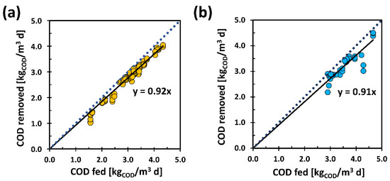 COD removal yields with TBSS (a) and DBSS (b). The continuous black lines represent the fitting of COD removed as a function of COD fed while the dot blue lines represent the condition of complete COD removal.