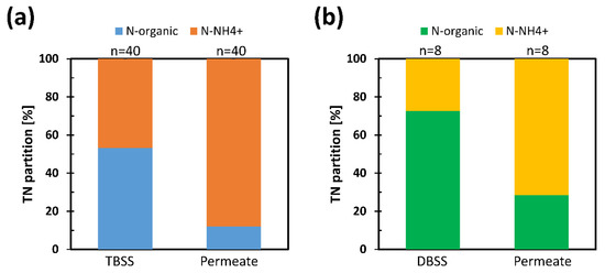 TN partition (a) in TBSS and (b) in DBSS. TN: total nitrogen, TBSS: thickened biological sewage sludge, DBSS: digested biological sewage sludge, n: number of data.