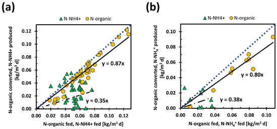 In TBSS, the total nitrogen entering ThAlMBR is made up equally of organic and ammoniacal nitrogen, while in DBSS the prevalent form of nitrogen is organic (about 70%). In both cases, the ammonification phenomena due to the thermophilic biomass is evident in the permeate output. The ammonification process was investigated in more detail by evaluating the production yields of ammoniacal nitrogen and calculating the amount of organic nitrogen converted. The results are shown in Figure 4.