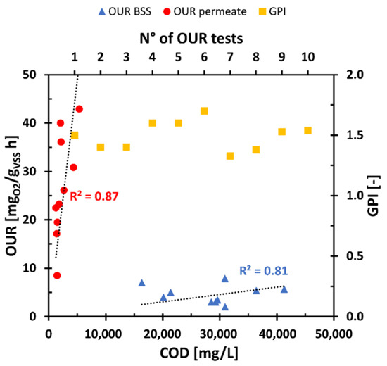 Each curve represents a test carried out on the same BSS or permeate sample, respectively. For each test, the sample was tested not diluted (associated with the major COD), and at least with three dilutions (COD decreasing with the dilution increasing). As the dilution factor increased, the OUR values increased and therefore the biodegradability of the tested substrates. Trends of this type are characteristic of substrates with a toxic-inhibiting effect on biomass [50]. This effect is linked to the presence of harmful substances in the tested substrate which could disturb and, in the worst cases, inhibit the biomass put in contact with the substrate. The results showed that the toxic-inhibiting effect can be reduced by suitably diluting the analyzed substrate and the increase in OUR with the dilutions was not excessively marked, demonstrating a reduced acute toxicity for mesophilic biomass.