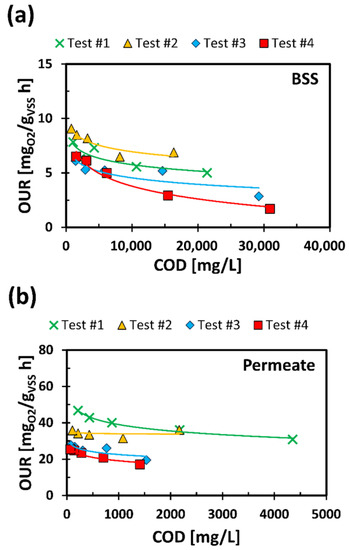 OUR trend with COD, for fed BSS (a) and permeate (b). Continuous lines represent the fitting of OR as a function of COD.