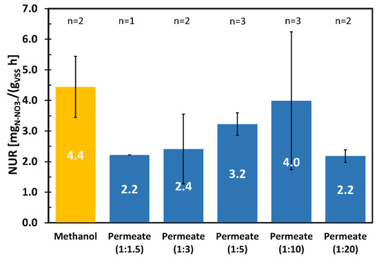 The highest NUR value was obtained with methanol. Of all tests carried out with the permeate, the best result was obtained by diluting the permeate 1:10, as it is comparable with the NUR value of methanol. Tests carried out at lower permeate dilutions (1:1.5; 1:3; 1:5) showed a lower denitrification rate, probably due to a slight toxic-inhibiting effect of the substrate on mesophilic bacteria (resolved by increasing the dilution). The excessive dilution of the permeate (1:20) determined a lower NUR probably due to a low amount of bioavailable COD, necessary for heterotrophic bacteria to carry out denitrification.