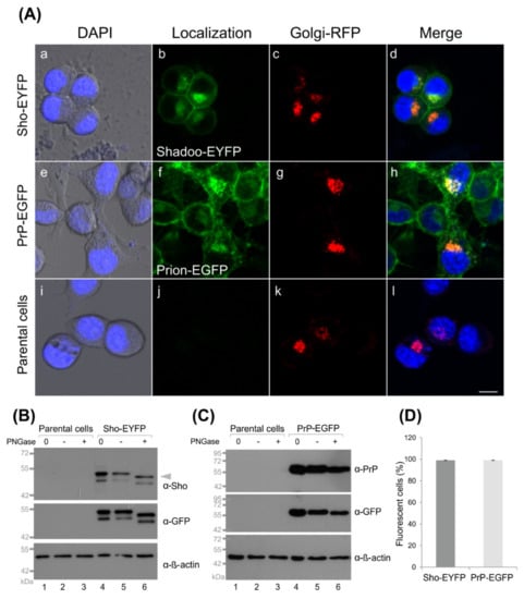 2.5.2. N2a PrP-EGFP, Sho-EYFP, Sho-FLAG-EYFP and Their Respective Control Cells (EGFP, EYFP and EYFP-FLAG) Cells