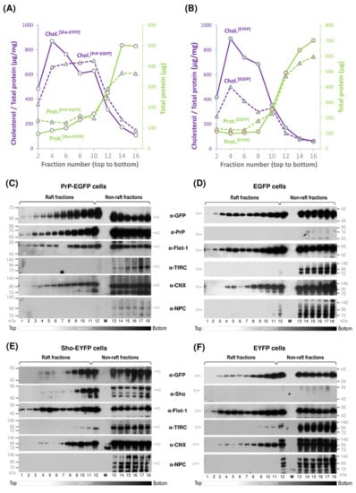 In order to discern which of the gradient fractions are the most reflective of a lipid-raft-like environment, we used the criteria followed by Persaud-Sawin et al. (2009) [89], according to which fractions that possess low protein content and high cholesterol content show the presence of flotillin-1 (which is known to be abundant in rafts) and the absence transferrin receptor (TfRC) (which is considered as a non-raft resident protein) are identified as raft-fractions. For easier assessment of the protein distributions, we classified the gradient fractions into three density classes: low-density (fraction numbers 1 through 8), mid-density (fraction numbers 9 through 12) and high-density (fraction numbers 13 through 18) fractions. The total protein amount profiles (Figure 3A,B, green solid- and dashed lines) across the gradients of Sho-EYFP and PrP-EGFP (Figure 3A), and the control, EYFP and EGFP (Figure 3B) cells show very low amounts in the low-density fractions and low amounts in the mid-density fractions, while the bulk of the proteins is found in the high-density fractions. Measuring the total cholesterol content of the same fractions, high cholesterol amounts are typically found in the low- and mid-density fractions, with the highest being in fraction #4, and they decline towards high-density fractions #12 through 18, which is contrary to the total protein amounts (Figure 3A,B, purple solid- and dashed lines). Furthermore, using Western blot analysis, we followed the relative distributions of flottilin-1 (a known raft resident protein) and transferrin receptor (as a known non-raft protein) in the collected fractions from the four types of cells (Figure 3C–F). In general, flotillin-1 distributes across the entire gradient from the bottom to the top (high- to low-density fractions), in line with earlier observations [78,90,91], while transferrin receptor, which is known as non-raft resident protein [92,93,94], is mostly retained in high-density fractions, starting from fractions 12 through 18. The “true raft” criterion was analyzed for each sample, but in general, beginning from the top low-density fraction through to the 11th fraction of the mid-density region, the raft criteria was fulfilled.