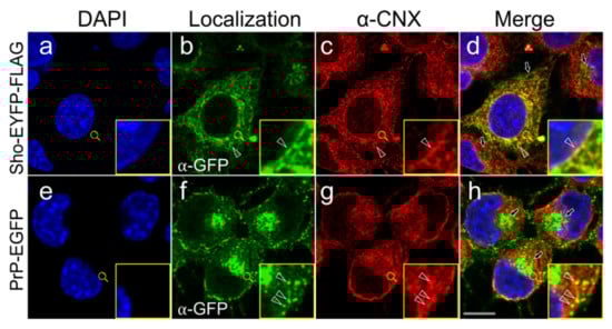 Here, the Sho and PrP’s fine ER localization to both the perinuclear and the peripheral ER network, including to both the tubular ER and the sheet-like ER cisternae, is observable. These ER compartments are occupied also by CNX, which has a marked presence in the tubular ER structures. In Sho-EYFP-FLAG cells, Sho is clearly seen localized also around the nucleus marking the nuclear envelope membrane perfectly, where it also has a complete colocalization with CNX (Figure 5a–c). Sho is also equally seen localized to the tubular ER and smooth ER sheets, where it also colocalizes with CNX. In the PrP-EGFP cells, PrP is also present in the nuclear membrane, but it does not characteristically highlight the nuclear envelope, and similar to Sho, it is present also in the tubular ER and ER cisternae (Figure 5d). In all three compartments, CNX is also present and apparently has a complete colocalization with PrP (Figure 5d–f). Apart from these three ER compartments, Sho and PrP are present in the GA and PM, where CNX is absent.