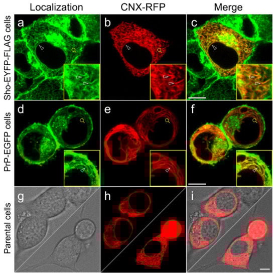 Live-cell analysis shows colocalization of Shadoo and prion proteins with calnexin in the ER membrane network. Stable transgenic Sho-EYFP-FLAG (a–c) and PrP-EGFP (d–f) cells expressing EYFP-FLAG-tagged Sho and EGFP-tagged PrP (green), respectively, and parental N2a cells (g–i) are transiently transfected to express red fluorescent protein (OFPSpark)-tagged calnexin (CNX-RFP, (g–i), red). Merged images from the green and red channels show the overlapping fluorescence in yellow. Insets show representative ER areas corresponding to positions of the magnifying glass symbols, magnified and with intensity enhancement for better visualization. Arrowheads point to examples of areas with colocalization. Scale bar: 10 µm.