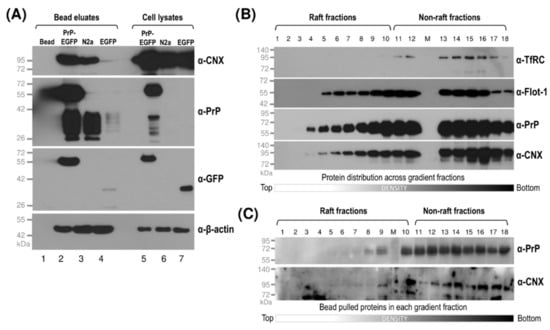 Next, we aimed to analyze if there is any preference for the interaction of prion proteins and calnexin depending on the type of membrane domains that the proteins reside in. During gradient fractionation and Western blotting of PrP-expressing cells (either PrP-EGFP, PrP(+EGFP) or parental N2a cells), we found that PrP and CNX are usually present in the same gradient fractions and that their detection by the antibodies used is also good (e.g., Figure 6B). These made it feasible to perform individual pull-down assays from each fraction. After density-gradient fractionation and Western blot analysis of the collected fractions of the PrP-EGFP cells, we identified the raft-type fractions from those ranging from 1 to 11 and the non-rafts one from 12 through 18, based on monitoring flottilin-1 and TfRC proteins, and confirmed the presence of PrP and CNX along the fractions (Figure 6B). To test for their interaction, we subjected the individual fractions to Ni-NTA bead-pull-down assay. Ni-NTA beads naturally bind PrP through PrP’s OR region, without the need to use an intermediary antibody. Testing the bead eluates for the presence of both proteins PrP and CNX by Western blot analysis of the bead-pulled fractions, we can observe the presence of both PrP and CNX starting from low-density fraction #5 through the mid- and high-density fractions up to #18, indicating that CNX is pulled in both raft and non-raft membranes (Figure 6C). The “only bead” condition was used as a negative control and presented no background signal (not shown), as previously seen for total cell lysates (Figure 6A). We obtained qualitatively similar results in at least four repeated experiments. Overall, these results indicate that prion and calnexin may interact in both raft- and non-raft-type membrane domains.