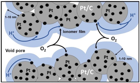 Further studies have revealed that the observed performance decline is caused by increased mass transport losses [,,,,,,,]. In the cathode catalyst layer (CCL), the oxygen pathway to the oxygen reduction reaction (ORR) site includes diffusive transport along the void pore, dissolution in the thin ionomer film and diffusion through the film to the Pt surface (Figure 1). Qualitatively, a lower number of ORR sites in the low-Pt electrode means higher oxygen and proton flux per site, making the ionomer film quite a significant barrier for oxygen transport to the site. Thus, in high-Pt cells, the effects of oxygen transport through the film are marginal, while in low-Pt cells, this transport gives quite a substantial contribution to the potential loss. Another explanation of the over-linear transport loss by the vulnerability of low-Pt electrodes to flooding has been suggested in [].