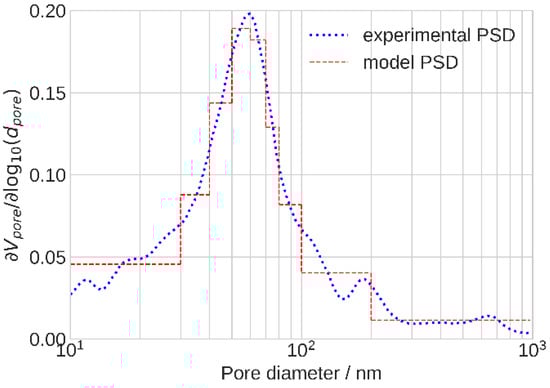 In our case, we operated at current densities below 1.0 A cm−2, and we could assume that the produced water was transferred from the catalyst surface to the gas channel in vapor form and did not noticeably flood the CCL []. Since initially the CCL was properly humidified, and there were no conditions for flooding the ionomer, film resistivity should not have been significantly affected by the operating current. We expect that a more accurate could be obtained from impedance measurements using a more detailed approximation of an experimental PSD.