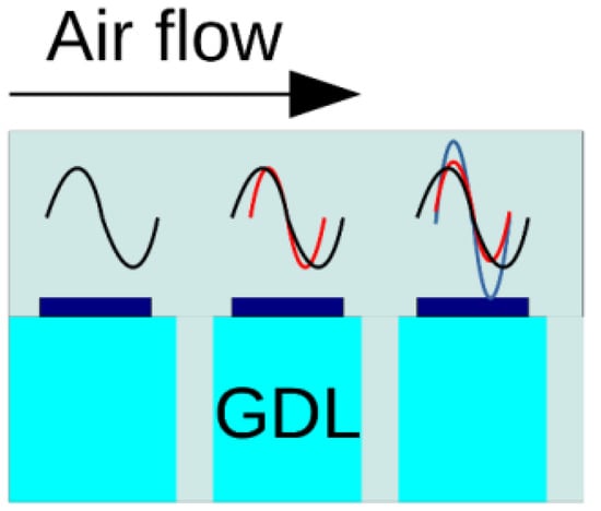 Linearization and Fourier-transform of the transport equations lead to a system of equations for the AC perturbation amplitudes in the ω-space []. This system is solved numerically for every individual segment, taking into account transport of oxygen concentration perturbations with the channel flow (Figure 4). Air flow in the cathode channel transports local oxygen concentration perturbations to the segments located downstream. Thus, the local sums up with the transported perturbations, which affect the local impedance.