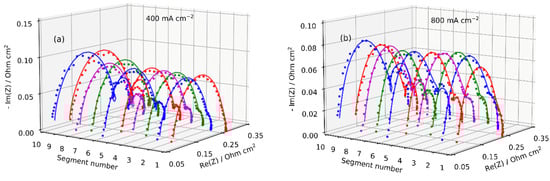 The local impedance spectra were measured at the operating conditions listed in Table 1. Figure 5 demonstrates experimental and fitted Nyquist spectra for the current density of 400 and 800 mA cm−2. Typical impedance spectra for a PEM fuel cell are represented by a semicircle at high-frequency, reflecting a charge transfer, proton and oxygen transport within the cathode layer, and a low-frequency (LF) arc caused by oxygen transport in the channel [,]. The local EIS results show an increase in the LF arc size from the cell inlet (segment 1) to the outlet (segment 10) and clearly illustrate the effects of O2 depletion along the flow field (Figure 5a). At the outlet segments 8 to 10, the LF part of the spectra becomes noisy, and the quality of the fitting decays (Figure 5). However, this arc represents oxygen transport in the gas channel, while the characteristic frequency of ionomer film impedance is at least an order of magnitude higher []. Overall, the results show that the proposed model ensures a good fitting of the local EIS data at low and high current densities.