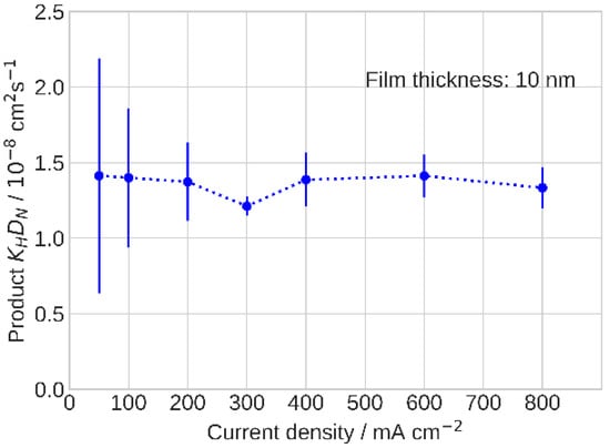 The product KHDN that resulted from the fitting is nearly constant as the cell current density increases (Figure 6). The only imaginable difference between the low- and high-current cell operation is the amount of liquid water in the catalyst layer, which increased with the cell operating current. The authors [,,,,] measured the ionomer film oxygen diffusivity DN using electrochemical methods and reported DN and O2 permeability growth with the relative humidity, which agreed with the classic works of T. Sakai and K. Broka [,,].