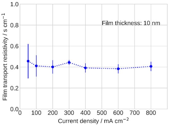 here, is the radius of the k-th pore in the spectrum. The determined film resistivity is close to the literature data of ≃ 0.3 s cm−1, corresponding to Pt loading of 0.1 mgPt cm−2 [,,]. In the studied range of currents, is found to be nearly constant at ≃0.4 s cm−1 (Figure 7).