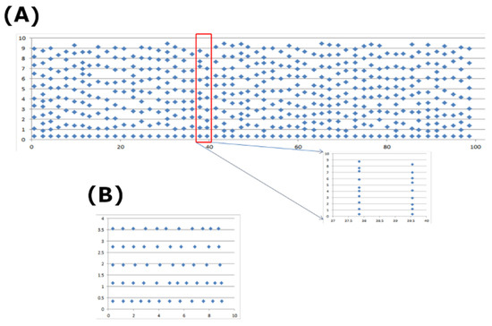 The general mechanism for Ca2+ wave propagation is the fire-diffuse-fire model [24,25] with an estimated wave velocity of 67 µm/s with CRUs at d = 2.0 µm apart. For sustained Ca2+ wave propagation, there are two important factors: first the diffusing Ca2+ from one Z-line should be able to activate the CRU in the next Z-line, and then calcium release from this CRU should be able to activate the neighboring ones in the same Z-line, and the process repeats. Given the shorter nearest neighbor distances for CRU on the same Z-line, in Figure 4, the CRUs on the same Z-line should be activated first during a Ca2+ wave initiation. This result is in agreement with the prediction that a single spark is unlikely to trigger a spark at the next Z-line [26,93].