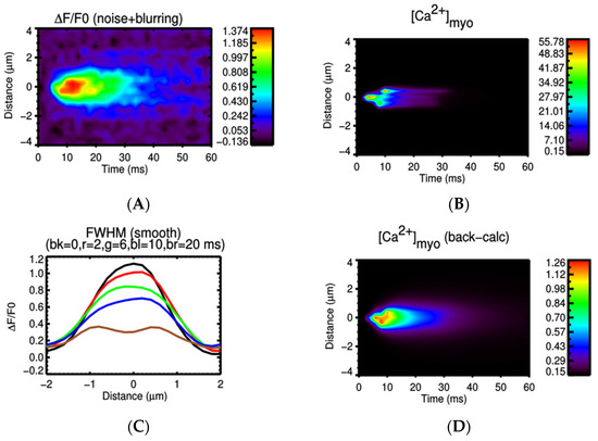 Using the simulation data, a multitude of information can be extracted. Apart from a snapshot of a pseudo-line scan calcium transient during Ca2+ transient along the longitudinal direction, as shown in (A), we are able to show (B) the dynamics of free calcium content, (C) the dynamics of calcium-bound fluorescent, (D) the dynamics of total calcium content.