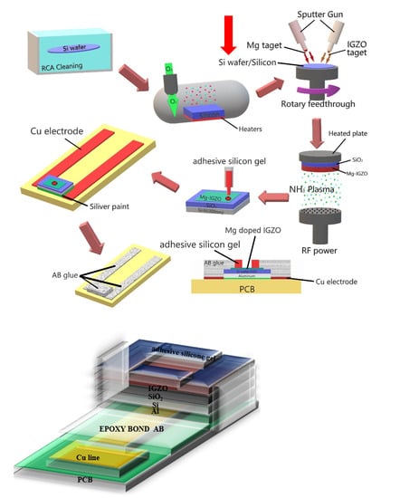 To fabricate InGaZnO sensing membranes on electrolyte-insulator-semiconductor structures, the structure was deposited on 4-inch n-type (100) silicon wafers with resistivity of 5–10 Ω-cm [25]. To remove any native oxide, the wafers were cleaned using HF (HF:H2O = 1:100). Next, 50-nm SiO2 was grown by thermal wet oxidation. In our experiment, InGaZnO and Mg targets were purchased from Gredmann Company, Taiwan. Then, in the condition, 50-nm InGaZnO was deposited on the wafer by radio frequency (RF) reactive sputtering with a mixture of Ar and O2 (Ar:O2 = 23:2) ambient during sputtering [23]. In the second condition, a 50-nm Mg-doped InGaZnO sensing membrane was deposited by co-sputtering on the wafer. During the reactive sputtering, InGaZnO and Mg targets were used in an ambient of Ar:O2 at 23:2 with RF power at 80 W and ambient pressure of 1.3 Pa. Both undoped and Mg-doped samples were subjected to a post-NH3 plasma treatment in a plasma-enhanced chemical vapor deposition (PECVD) system with an RF power of 30 W for 1 min and 3 min, respectively. The NH3 plasma treatment was performed by a PECVD and the model and make of the PECVD was Sancom and PD-240. An Al film 300 nm in thickness was then deposited on the backside of the wafer. Next, adhesive silicone gel was used to define a sensing window. Finally, the samples were fabricated in silver gel on the copper lines of a printed circuit board. An epoxy package was used to separate the EIS structure and the copper lines. Since the EIS structure is not stable because defects between interface layer and silicon. To overcome the problem, incorporation of NH3 plasma treatement were used to optimize the sensing performance. The detailed fabrication process is illustrated in Figure 1.