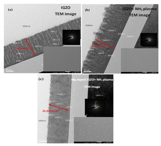 TEM images with SAED, FESEM sub-images for (a) IGZO sample (b) IGZO with NH3 plasma treatment (c) Mg doped IGZO with NH3 plasma treatment.