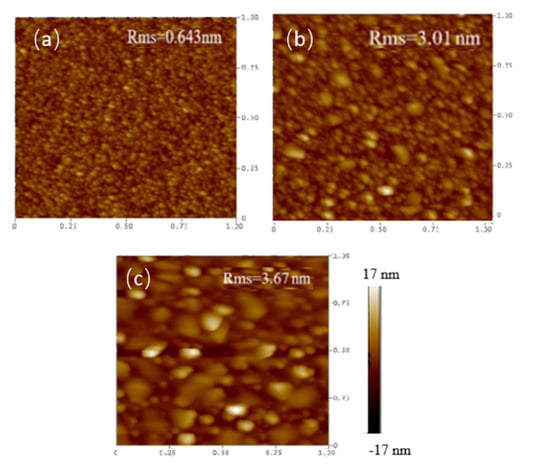 AFM images for (a) IGZO sample (b) IGZO with NH3 plasma treatment (c) Mg doped IGZO with NH3 plasma treatment.