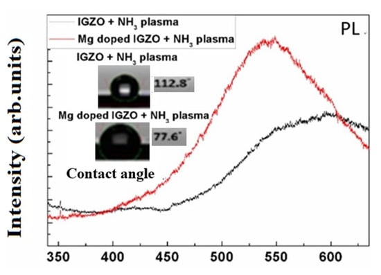 PL spectra and surface contact angle measurements for IGZO with NH3 plasma treatment and Mg doped IGZO with NH3 plasma treatment.