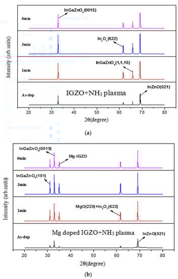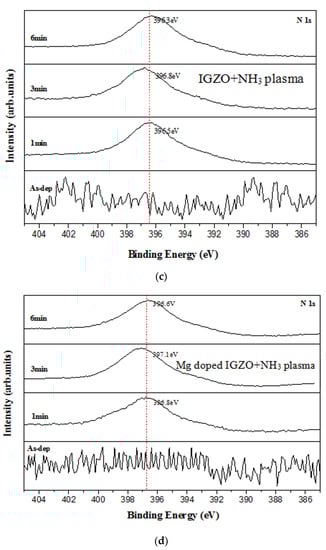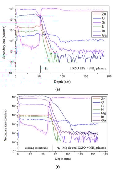 In addition to studying morphologies, XRD, XPS, and SIMS were used to investigate the crystalline phases, chemical bindings, and incorporated atoms versus depth, respectively [4]. Figure 5a,b show XRD patterns for the undoped InGaZnO and Mg-doped InGaZnO membranes with various NH3 plasma treatments, showing that Mg-doping and plasma treatment could enhance the crystalline phase. The strongest crystallization occurred in the 3-min plasma treatment of the Mg-doped samples. As the plasma treatment time increased to 6 min, the crystalline phase became weaker. In addition, Mg co-sputtering can form magnesium oxide (MgO) crystals into IGZO as shown in Figure 5a,b and therefore, the sensing behavior can be improved [30,31]. The electronegativity of Mg (χ = 1.31) is low and stablize the binding with oxygen [32]. Moreover, magnesium atoms can replace the vacancies and repair dangling bonds to passivate defects in oxides [33]. Therefore. the membrane films with better material quality can have better pH sensing capability.