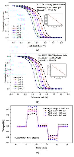 Figure 6a,b show the sensing capability measurements for the undoped and Mg-doped membranes with NH3 plasma treatment for 3 min. Results indicate that the pH sensing sensitivity for the undoped InGaZnO membrane achieved 62.28 mV/pH, which was above Nernst limit. However, the sensitivity of the Mg-doped membrane was as high as 65.85 mV/pH, indicating that both Mg doping and NH3 plasma treatment could effectively enhance crystallization, reduce defects in the bulk and interface, and reinforce membrane material quality. As shown in Table 1, the sensitivity of NH3 plasma treated InGaZnO sample and Mg doped InGaZnO sample have pH sensitivity of 62.28 and 65.85 mV/pH, which are above Nernst limit (around 60 mV/pH), while the InGaZnO and Mg-doped InGaZnO sample with appropriate annealing at 500 °C have the pH sensitivity of 56.51 and 59.3 mV/pH, which are below Nernst limit. Compared with plasma treatment with other gases, NH3 might be more effective. Since nitrogen (N) was similar to oxygen (O) in regard to ionic radius and acts as a better compensator, NH3 plasma was used in the post-treatment of sputter film. Therefore, we investigated the impact of NH3 plasma treatment on the sensing behavior, surface morphology, and crystal structure. Due to the NH3 plasma treatment, plasma-induced morphological changes and increment of grain size were observed, favoring the increase of surface roughness and number of surface defect sites, and thus resulting in higher sensitivity and linearity. The surface charge density was mainly related to the ionic activity in the solution.