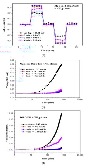 Hysteresis voltage measurements were then taken for the undoped and Mg-doped membranes, shown in Figure 6c,d, respectively, show that NH3 plasma treatment with a time of 3 min can effectively suppress hysteresis voltage, possibly from the removal of the dangling bonds and traps [34]. Compared with the as-deposited InGaZnO film and the as-deposited Mg doped film, the NH3 plasma treatment could lower the hysteresis voltage from 18.42 to 1.68 eV for the undoped sample and from 16.62 to 1.01 eV for the Mg-doped sample, respectively.