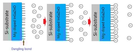 Finally To examine the drift rate voltage for long-time reliability, the samples were submerged in a pH7 buffer solution for 12 h. Consistent with the material and sensing characterizations, drift voltage rate measurements for the undoped and Mg-doped samples revealed that NH3 plasma treatment could effectively remove the defective bindings as shown in Figure 6e,f. Plasma treatment could potentially cause the membrane to bind with ions in the solution. Moreover, Mg doping could further lower both the hysteresis voltage and drift rate, since incorporated Mg atoms might fill in the vacancies and bind with dangling bonds to enhance material quality. The drift voltage shift could also be induced by the ions captured by the dangling bonds, too. To illustrate the voltge shifts in the hysteresis and drift voltage measurements, Figure 7 explain the mechansim for hysteresis and drift voltage shifts caused by dangling bonds. In the beginning, no ions were attached on the dangling bonds. As the measuring time passed by, more and more ions were captured by the dangling bonds and the gate voltage shifts might occur as shown in Figure 7.