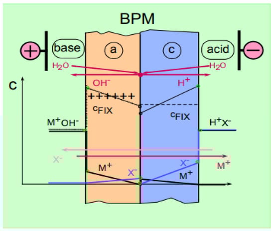 When the bipolar membrane is located with the cation-exchange side to the cathode and the anion-exchange one to the anode, the membrane generates H+ and OH- ions due to the splitting of water molecules, even with a small electric field voltage at the interface between the layers [] (Figure 1 and Figure 2).