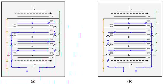 Schematic diagram of the electrodialysis process for the correction of acidic (a) and alkaline (b) solutions: AEM-anion, CEM-cation, and bipolar membrane (BPM); ----x---- initial solution, ---/-- product and ---//--- concentrate.