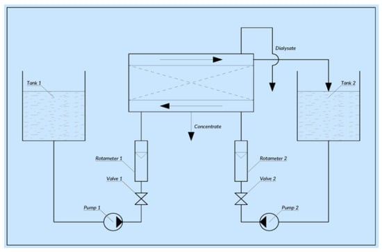 The thickness of each chamber is 1.2 mm, and the effective working area of one membrane is 0.124 m2. The membrane package was hydraulically assembled in parallel, which provides the same process conditions in all chambers. The initial solution was not supplied to the concentration chambers. The movement of fluid in these chambers was carried out due to the electroosmotic transfer of the solvent from the dialysate chamber.