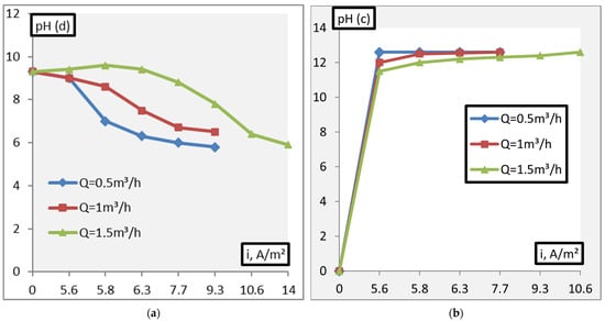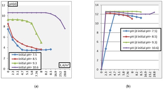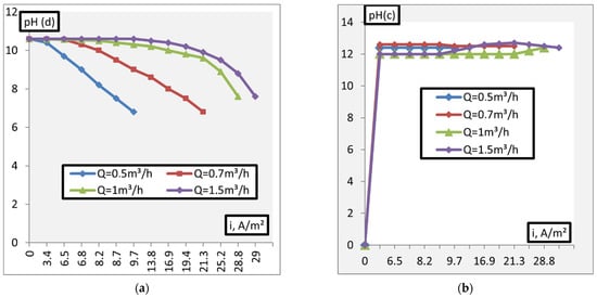 Dependence of the pH. (a)—pH(d), (b)—pH(c)) adjustment of alkaline solutions on the current density (d—dialysate, c—concentrate).