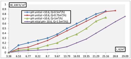As follows from the data obtained, the intensity of change in the acidity of the solution depends on the current density and apparatus process performance: With an increase in the value of these indicators, the pH of the product increases and, consequently, the energy consumption of the process increases. Figure 11 presents data on dependence of the energy consumption of the process of adjusting acidic solutions on the current density.
