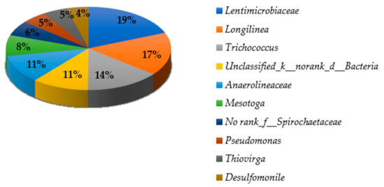 Figure 2 illustrates the bacterial diversity of cake layer in genus level. The genus Lentimicrobiaceae was dominant, accounting for 8.47% in the cake layer. Lentimicrobiaceae belonging to Bacteroidetes was strictly anaerobic methane producing slow-growing bacteria [44]. Genus Longilinea was secondly dominant while genus Trichococcus was thirdly dominant accounting 7.50% and 6.49% respectively from the total abundance. Trichococcus was reported in anode biofilms [45], and on polypropylene filter media in a fixed biofilm reactor for wastewater treatment. The genus Anaerolineaceae (4.88%) containing carbohydrate-fermenting acetogenic filamentous bacteria was also recorded here [44]. Filamentous bacteria can more easily adhere to the membrane surface. However, in-depth analysis of bacterial composition in genus level in membrane cake layer was very limited in most studies.