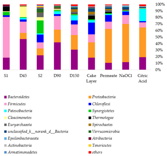 Figure 4 shows the presence of different bacteria phyla in the bulk sludge, cake layer and the cleaning solutions. In this study two seed samples were used on Day 01 and 50 respectively, (i) from the Gao’antun wastewater reclamation plant in Beijing which is a partially hydrolyzed thermophilic sludge, (ii) anaerobic digester sludge from lab scale reactor treating potato starch wastewater at mesophilic conditions [11]. The first seed sludge was dominant with Bacteroidetes (18.6%), Firmicutes (62.3%), Synergistetes (4.96%) and Thermotogae (7.08%). The second seed sludge was dominant with Bacteroidetes (22.3%), Proteobacteria (10.19%), Firmicutes (9.60%), Synergistetes (19.8%), Verrucomicrobia (5.51%), and Euryarchaeota (6.94%). On Day 150, the bulk sludge was dominant with Bacteroidetes (30.92%), Proteobacteria (22.4%), Firmicutes (15.97%), Chloroflexi (6.10%), Patescibateria (7.92%), Spirochaetes (4.15%), Synergistetes (1.36%) [11]. The reactor operational conditions such as SRT, Hydraulic Retention Time (HRT), temperature evidently affect the microbial community development in the bulk sludge and membrane fouling. This was discussed in our previous work [11]. Here, the cake layer microbial community is shown in Figure 4. Remarkably, the cake layer bacterial community were very similar to those of the bulk sludge on Day 150. In some previous research, the microbial community in bulk sludge and membrane fouling layer were also similar in MBR systems treating municipal wastewater [1,24].