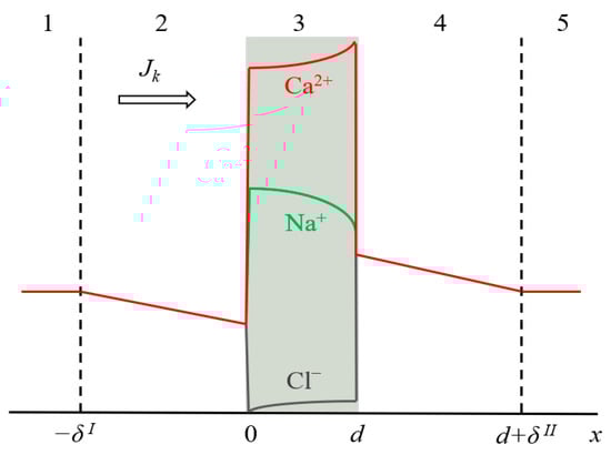 Schematic representation of the simulated system, including an ion-exchange membrane of thickness d (3) and two DBLs (2 and 4) of the thickness δI and δII, respectively. Zones (1) and (5) are the bulk solution. The typical concentration profiles are given in the case of CC mode: for ion k in the diffusion layers (k = Na+, Ca2+ or Cl−), and for all three ions in the membrane.