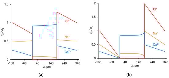Concentration profiles of ions in CC mode at: Uav = 111 mV (i = 0.3 ilim) (a); Uav = 476 mV (i = ilim) (b). The concentrations are normalized by c0; c0 = in the diffusion layers ( is the concentration of Cl− ions in the bulk solution), and c0 = Q in the membrane.