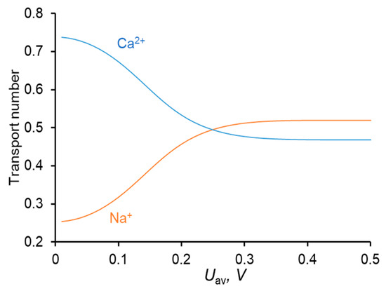 Dependence of the transport numbers of Ca2+ and Na+ ions in the membrane on the time–average voltage.