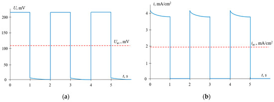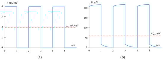 The case where constant voltage pulses alternate with pauses, during which the current density is zero (i = 0), is considered since it is often used in practice [14,16]. In this case, the results are compared at the same value of the time–average voltage, Uav, which is linked with the voltage during the pulse, Upulse, as Uav = αUpulse.