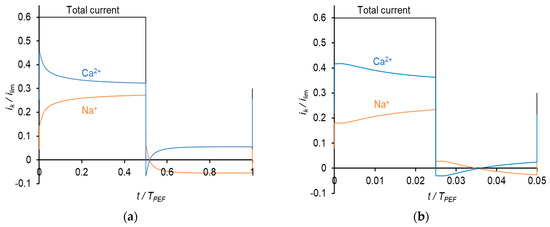 The time dependences of the partial current densities of Na+ and Ca2+ ions at a frequency of 0.5 Hz are shown in Figure 7.