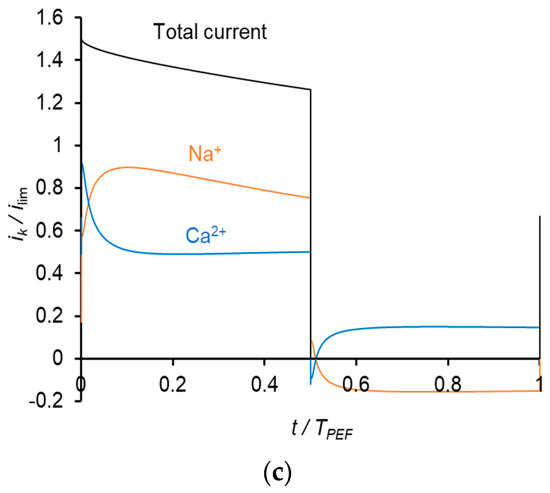 here index k is related to counterions (Na+ or Ca2+) and A to coion (Cl−); δ is the thickness of the depleted diffusion layer (δ = δI), which was estimated from the hydrodynamic parameters of the experimental system [17]. Since the model does not take into account all the components of the experimental solution, in particular K+, which is the dominant cation [17], the calculated limiting current density ilim = 6.52 mA/cm2 is lower than the experimental one (13.5 mA/cm2). However, in this paper, we are not aiming for quantitative agreement with the experiment. The goal is to understand whether taking into account electromigration and diffusion is sufficient to obtain a qualitatively correct picture of the effect of PEF on membrane permselectivity for a specific ion.