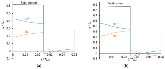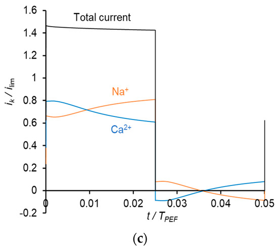 Similar results were obtained at the frequency of PEF of 10 Hz (Figure 8). However, due to a shorter duration of the pulse, the Na+ current density during a pulse lapse becomes greater than the current density of Ca2+ at a higher value of the average voltage (Figure 8c) than in the case of 0.5 Hz (Figure 7b).